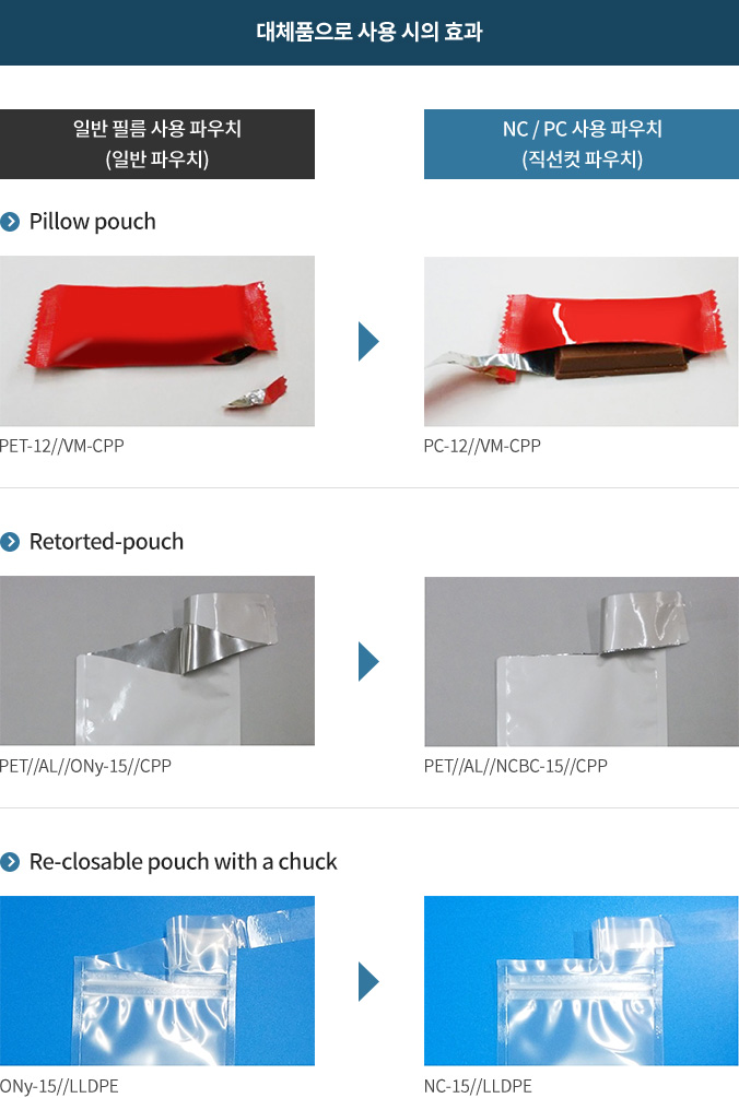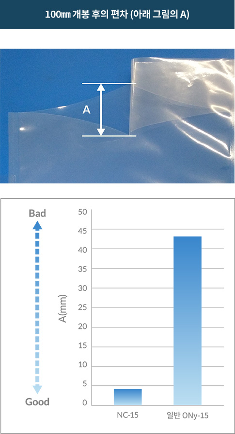 | 직선컷 | NC | 15 | 코로나처리 | - | 도구 없이 손으로도 일직선(MD방향)으로 쉽게 개봉 가능합니다 OTR : 160ml/m2·d·Mpa(20℃Ⅹ65%RH) |